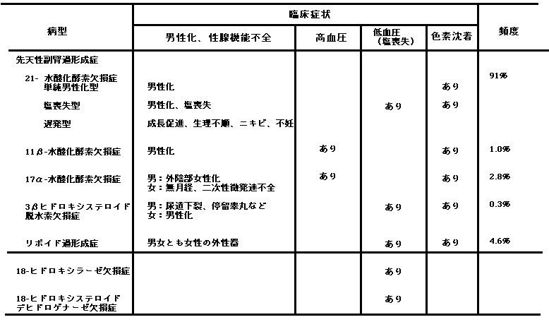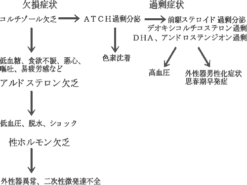 先天性副腎過形成症ではコルチゾールとアルドステロンが不足することから、低血糖、食欲不振、易疲労感、低血圧、塩喪失、循環障害、ショックなどがみられます。電解質異常として低ナトリウム血症、高カリウム血症がみられます。またACTH過剰による症状として皮膚に黒色の色素沈着もみられます。その他病型によりさまざまな外性器異常がみられますが、性ステロイド過剰による外性器異常として女児外性器の男性化(陰核肥大、共通泌尿生殖洞など)、逆に性ステロイド不足による異常として男児に尿道下裂、停留睾丸や女性型の外性器などがみられます。男児のリポイド過形成症、3β-ヒドロキシステロイドデヒドロゲナーゼ欠損症、17α-水酸化酵素欠損症では、性ステロイド不足が起こることから外性器は女性化の異常を示し、一方女児の21水酸化酵素欠損症、11β-水酸化酵素欠損症では外性器の男性化の異常がみられます。新生児期から治療をうけていない場合には男女とも思春期早発症がみられることがあります。さらに女児の3β-ヒドロキシステロイドデヒドロゲナーゼ欠損症では性ステロイドが増加することから外性器の男性化がみられます。女児の17α-水酸化酵素欠損症では女性ホルモンが不足することから二次性徴発達不全や無月経がみられます。その他、鉱質コルチコイドが不足する18-水酸化酵素欠損症、18-ヒドロキシステロイドデヒドロゲナーゼ欠損症ではアルドステロン不足のみの異常であることから低血圧、塩喪失などの症状が主にみられます。その他11β-水酸化酵素欠損症では高血圧がみられます。P450オキシドレダクターゼ欠損症では女児では出生時、外性器の男性化が認められます。逆に男児には尿道下裂、停留睾丸がおこります。また17α-水酸化酵素活性低下により性ホルモンが不足することから男子、女子においても二次性徴発達不全がおこります。さらに21-水酸化酵素活性低下によりコルチゾールが不足し副腎不全をおこすこともあります。またこの病気では頭蓋骨癒合症、橈骨上腕骨癒合症、大腿骨の彎曲、関節拘縮を伴うことがあります。