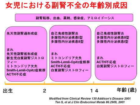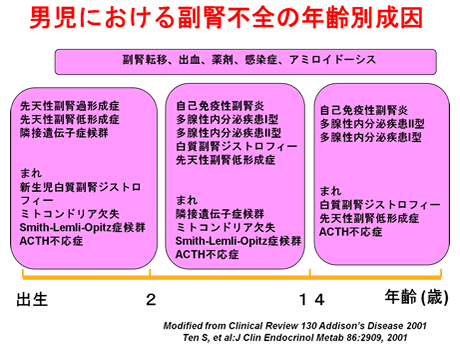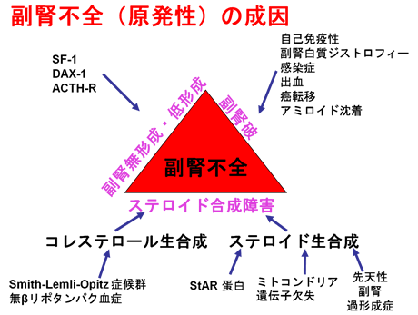 副腎皮質は3層の構造よりなり、球状層からはミネラルコルチコイドであるアルドステロンが、束状層からグルココルチコイドであるコルチゾールが、網状層から副腎アンドロゲンであるデヒドロエピアンドロステロン(DHEA)とその硫酸塩であるデヒドロエピアンドロステロンサルフェート(DHEA-S)が分泌されている。慢性副腎皮質機能低下症は、これらのステロイドホルモン分泌が生体の必要量以下に慢性的に低下した状態であり、副腎皮質自体の病変による原発性と、下垂体の副腎皮質刺激ホルモン(ACTH)分泌不全による続発性に大別される。原発性の慢性副腎不全は1855年英国の内科医であるThomas Addisonにより初めて報告された疾患であることから、Addison病とも呼ばれている。その後、この原発性慢性副腎皮質機能低下症の病因として、副腎皮質ステロイド合成酵素欠損症による先天性副腎皮質過形成症、先天性副腎低形成、ACTH不応症などが同定され責任遺伝子も明らかにされてきたことから、アジソン病は後天性の成因による病態を指し示し、先天性のものは独立した疾患単位として扱われるようになった。