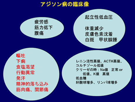 副腎皮質ホルモンの欠落により、易疲労感、全身倦怠感、脱力感、筋力低下、体重減少、低血圧などがみられる。食欲不振、悪心・嘔吐、下痢などの消化器症状、精神症状(無気力、不安、うつ)など様々な症状を訴える。いずれも非特異的な症状である。色素沈着は皮膚、肘や膝などの関節部、爪床、口腔内にみられる。