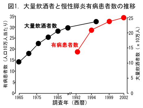 図1.大量飲酒者数と人口10万人当たりの慢性膵炎患者数の推移。大量飲酒開始15〜20年後に慢性膵炎は発症します。