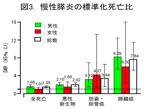 慢性膵炎患者の飲酒率は、日本人の平均飲酒率の3倍、喫煙率は、日本人の平均喫煙率の2倍と、悪い生活習慣を有している率が高い。