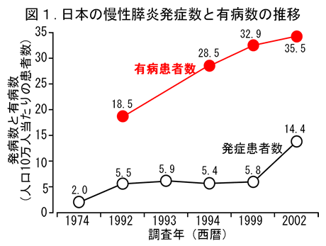 厚生労働省難治性疾患克服研究事業難治性膵疾患に関する調査研究班による2002年1年間の慢性膵炎推計受療患者数は45,200人(95%信頼区間35,600〜54,700)、年間推計受療数は人口10万人あたり35.5人、 2002年1年間の新規慢性膵炎発症患者数は、人口10万人当たり14.4人である。慢性膵炎の調査は過去4回実施されているが、それぞれの調査で、調査方法や診断基準が異なっているため、単純には比較出来ないが、慢性膵炎は年々増加してきている(図1)。