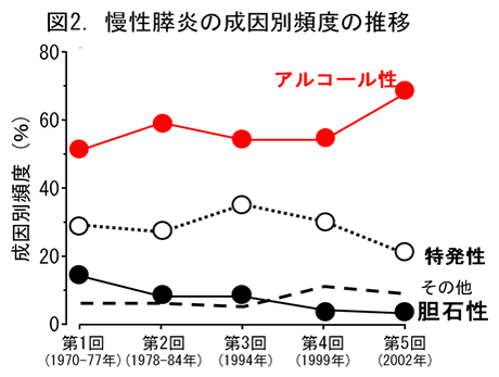 社会環境の変化、診断法の進歩などにより、アルコール性慢性膵炎が増加し、特発性と胆石性慢性膵炎が減少してきている(図2)。 画像診断の進歩により、原因を特定出来ない特発性膵炎が減少したと考えられる。また、胆石性膵炎が減少したのは、胆石の診断技術の進歩と腹腔鏡下胆嚢摘除術など、有胆石患者に対して早期に処置がなされるようになった結果であると考えられる。アルコール性膵炎が増加した原因としては、国民のアルコール消費量や飲酒者数の増加と、本邦の人口構成が変化し、高齢化が進行していることも関与していると考えられる。エタノールに換算して1日150 ml以上飲酒する大酒家は227万人であるが(http://ganjoho.ncc.go.jp/public/statistics/backnumber/odjrh3000000h332-att/data13.pdf)、アルコール性慢性膵炎は30,510人であり(慢性膵炎患者45,200人の67.5%)、大酒家の1.34%に相当する。所が、大量飲酒が確実である全国の男性断酒会会員7,876名を調査したところ、718名(17.4%)がアルコール性膵炎の既往があり、大酒家では膵炎の罹患率が高いと言える。