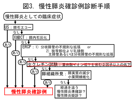 慢性膵炎の診断基準にはセクレチン試験と便中キモトリプシン、BT-PABA(PFD試験)の機能検査が採用されているが、日本ではセクレチン試験と便中キモトリプシン測定は施行出来ないので、現在は画像所見のみで慢性膵炎が診断されている。