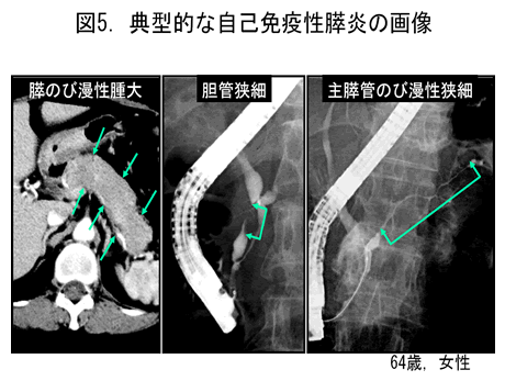 CTで膵はソーセージ様にび漫性に腫大し、ERCPでは胆管狭窄と主膵管のび漫性狭細像が見られる。