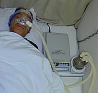 肺胞低換気により、動脈血中の酸素が低くなると酸素吸入をすることもあります。肺の病気による場合と同じように、酸素の供給減として、酸素ボンベ、空気中より窒素を除き、酸素を供給する酸素濃縮器、液体酸素ボンベを使用して在宅酸素療法を行います。4で説明しましたように、中枢性の低酸素抑制の強い人では、酸素吸入により、抑制がなくなり換気が増加する可能性もあります。しかし、酸素吸入では低換気は改善されない人もあり、この場合は換気量を増加させる他の治療法が必要です。