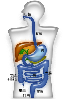 消化管は口腔にはじまり、咽頭、食道、胃、小腸(十二指腸、空腸、回腸)大腸、肛門までを指し、全長は約6mです。食物はこの消化管を通り、消化・吸収され、やがて流動体の残りかす(不要物)が大腸で糞便となり、排泄されます。
