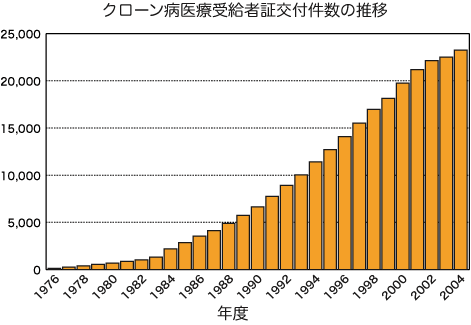 クローン病の患者数の推移を医療受給者証交付件数でみると1976年には128件でしたが、その後増加し続け、近年では毎年1,500人前後の増加がみられ、2004年度には23,188人の患者さんが登録されています。したがって人口10万人あたり約18.3人のクローン病患者さんがいることになりますが、欧米に比べると10分の1前後です。