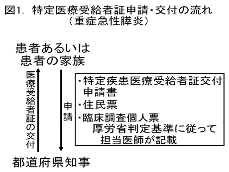 厚生労働省の難病対策事業の一つとして、特定疾患治療研究事業、すなわち医療費の公費負担制度があります。重症急性膵炎はその対象疾患の一つです。重症急性膵炎と診断されますと、患者さんまたはその家族の方が「特定疾患医療受給者証交付申請書」と「住民票」、さらに担当医師が記載した「臨床調査個人票」を添えて患者さんが住んでおられる地域を管轄する保健所、あるいは県庁へ申請します(どちらへ申請するかは地域によって異なっている)。認可されますと、原則として6ヶ月間の医療保険の自己負担分を、国と都道府県とで折半して負担します。しかし、申請後の医療費しか公費負担の対象になりませんので急いで手続きを行う必要があります。