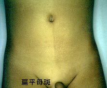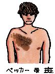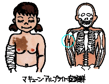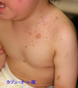 | 茶あざ | そばかす(雀卵斑) 扁平母斑 ベッカー母斑(遅発性扁平母斑) 色素性じんま疹 | フォン・レックリングハウゼン病(神経線維腫症) マッキューン・アルブライト症候群 色素失調症(ブロック・ザルツバーガー症候群) |