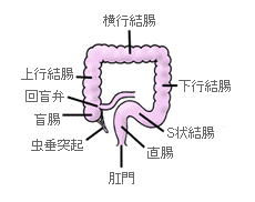 結腸が回盲弁から頭側へ上がってゆく部分を上行結腸,そこから左へ行く部分を横行結腸,足側へ下がってゆく部分を下行結腸といい,下行結腸と直腸の間はたるみがあり曲がりくねっているのでS状結腸といいます.直腸は肛門で終わっています.