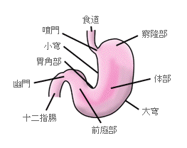 胃は食道と十二指腸の間にあります.胃の入り口,食道とのつなぎ目を噴門,出口つまり十二指腸とのつなぎ目を幽門といいます.胃のてっぺん付近を胃窮隆部,中心になる部分を胃体部,胃の出口に近い部分を胃前庭部とわけて呼びます.また,胃の上側の彎曲を小弯,下側の長い彎曲を大弯といいます.小弯の真ん中あたりの彎曲の強い所は胃角部といい,胃潰瘍がよくできる場所です.