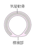 気管は鼻,喉と肺をつなぐ管で,一番上に声を出すための声帯がついています.下の端は二股に別れ,左右の気管支となっています.空気の通り道なので,管がつぶれないように一部が欠けた輪状の軟骨がたくさん並んで支えています.軟骨の輪が欠けた部分は気管の背中側にあり,膜様部という柔らかい膜になっています.